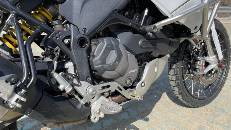 데저트 X는 지상고가 250mm이며, 시트고는 875mm로 상당히 높은 편이다. 비교적 무게중심이 높지만, 주행 안정성이 뛰어난 점도 인상적이다. 전면부 페어링의 공력 성능이 우수한 덕분인지 온·오프로드 겸용 타이어를 끼웠음에도 고속에서 불안함이 없다. 1.6m가 넘는 긴 휠베이스도 뛰어난 주행 안정성에 적지 않게 기여한 것으로 여겨진다.