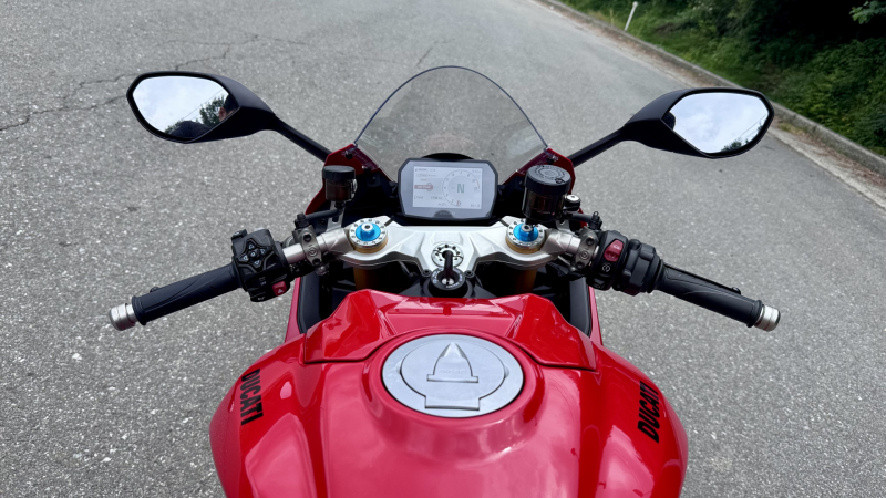 반면, 뉴 파니갈레 V2 S의 핸들바는 높이가 837mm인 시트보다 살짝 높다. 덕분에 포지션에 여유가 생겼다. 허리를 깊숙하게 숙이지 않아도 되니 도심 주행 시나 투어 때 피로가 적다. 물론, 어디까지나 상대적인 차이다. 네이키드나 투어링 모터사이클과 비교하면 뉴 파니갈레 V2 S의 핸들바는 여전히 낮다. 당연히 공격적인 자세가 연출된다.