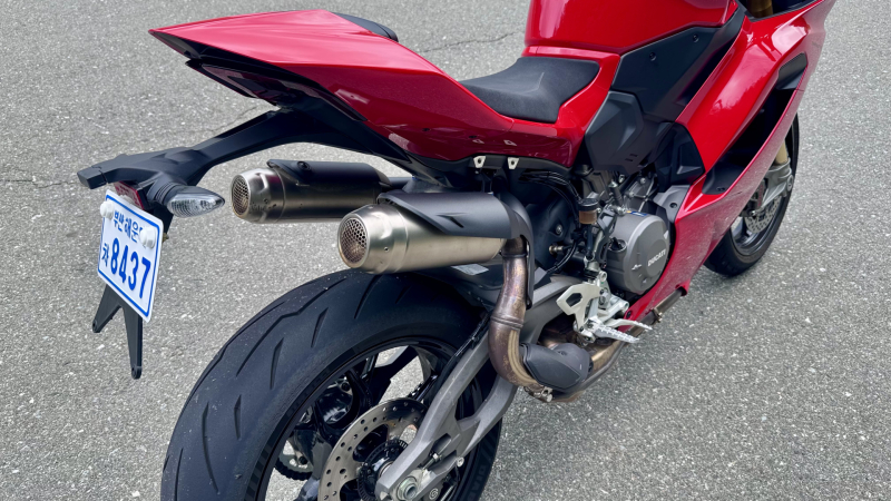 페어링 디자인의 변화와 함께 헤드라이트도 좀 더 날렵하게 변했다. 그럼에도 파니갈레 고유의 정체성은 여전하다. 뉴 파니갈레 V2 S가 가진 디자인의 백미는 뒷쪽에서 찾을 수 있다. 두 쌍의 배기구를 뒤타이어 위쪽으로 끌어올려 역동성을 극대화한 게 대표적이다. 또한, 구형의 싱글사이드 스윙암을 대체하는 더블사이드 스윙암과 결합해 기하학적이고 공격적인 이미지까지 강조하고 있다.